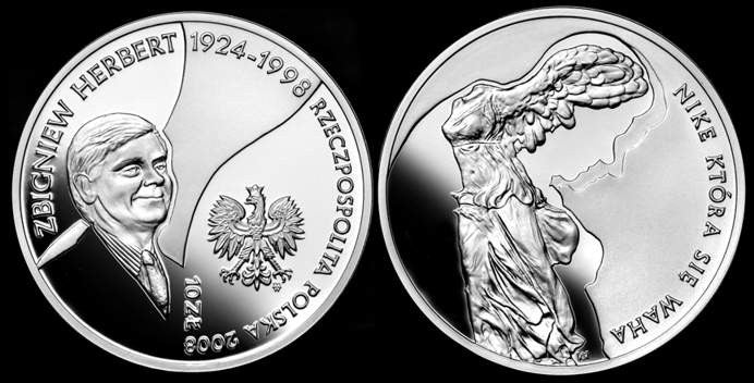Awers: Z prawej strony wizerunek orła ustalony dla godła Rzeczypospolitej Polskiej. Z lewej strony wizerunek półpostaci Zbigniewa Herberta. W otoku napis: ZBIGNIEW HERBERT 1924-1998 RZECZPOSPOLITA POLSKA oraz oznaczenie roku emisji: 2008. U dołu w środku pionowo napis: 10 ZŁ.
