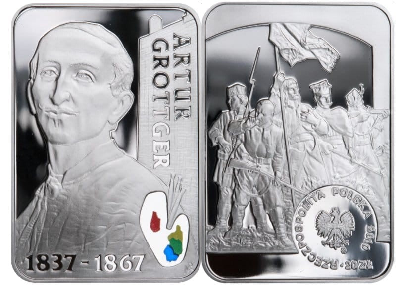 Rewers: Centralnie stylizowany wizerunek popiersia Artura Grottgera.