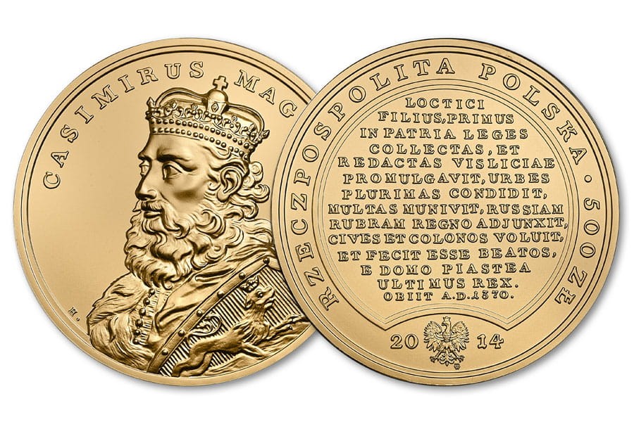 AWERS: W centralnej części monety – replika awersu medalu z życiorysem króla Kazimierza Wielkiego w języku łacińskim, jak następuje: „Syn Łokietka, pierwszy prawa ojczyste zebrał i ułożone w Wiślicy ogłosił, miast wiele obwarował, Ruś Czerwoną do Korony przyłączył, pragnął zrobić i zrobił szczęśliwymi obywateli i rolników; ostatni z domu Piasta król. Umarł roku 1370, mając lat 60, panowawszy lat 33. dnia 5. listopada”. Wzdłuż otoku – napisy: RZECZPOSPOLITA POLSKA i nominał: 500 zł. W dolnej części monety – rok emisji: 2014 oraz miniaturowy wizerunek orła białego z godła Rzeczypospolitej Polskiej.