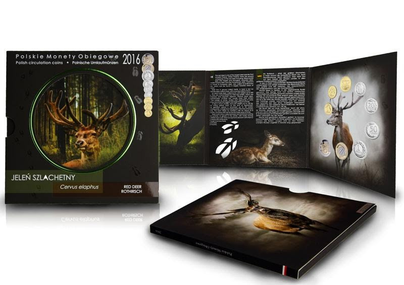 Monety obiegowe z 2016 roku (od 1 grosza do 5 złotych) umieszczone w ekskluzywnym blistrze z Jeleniem.