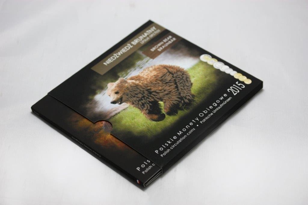 Monety obiegowe z 2015 roku (od 1 grosza do 5 złotych) umieszczone w ekskluzywnym blistrze z Niedźwiedziem.