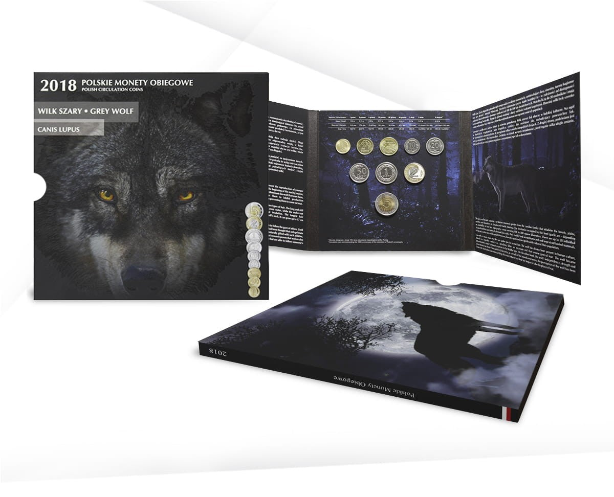 Monety obiegowe z 2018 roku (od 1 grosza do 5 złotych) umieszczone w ekskluzywnym blistrze z Wilkiem szarym.